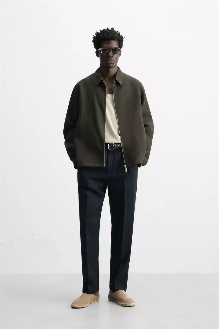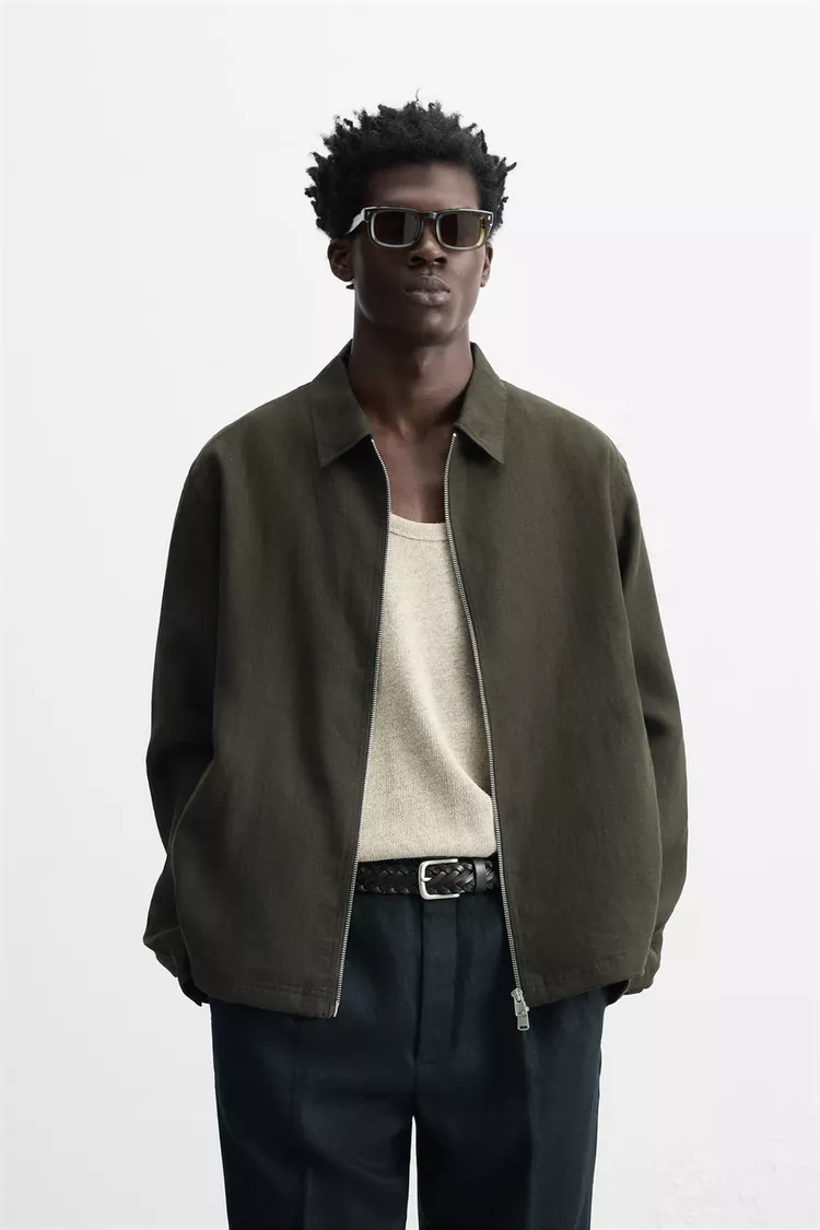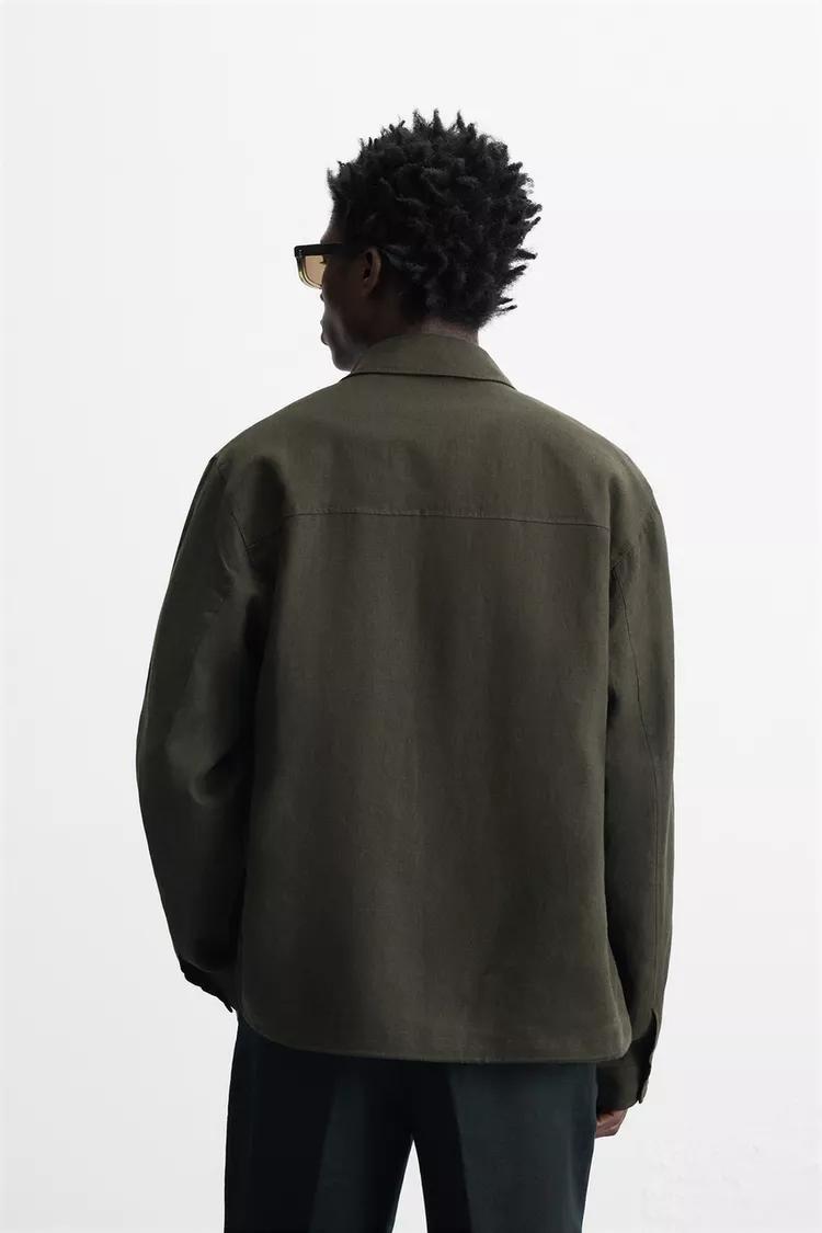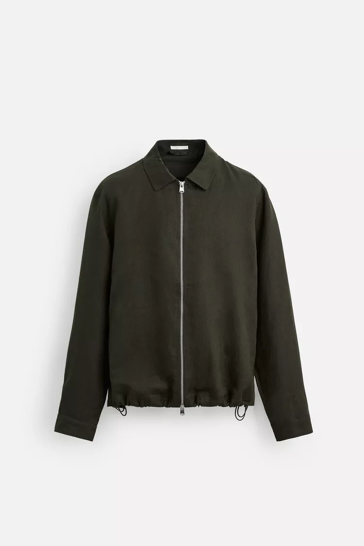 Regular fit overshirt made from linen fabric. Featuring a lapel collar, long sleeves with buttoned cuffs, side pockets at the hip, an adjustable hem with elasticated sides and a zip-up front.